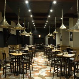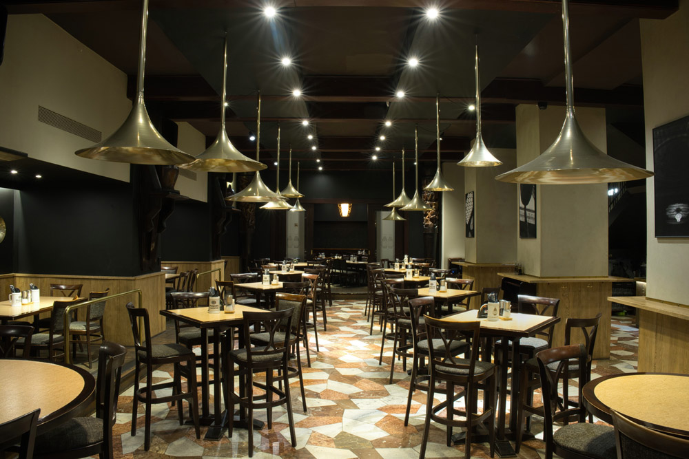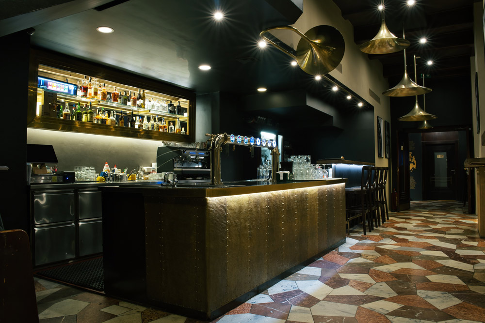 Klub má vlastní bar a funkční krb, interiér vybavený čalouněným nábytkem a vyzdobený portréty rodiny Havlů.